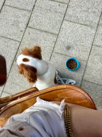 Ruby standing between my legs while I made my parfait and brushed my teeth, waiting for me to sit with her to enjoy her chicken foot