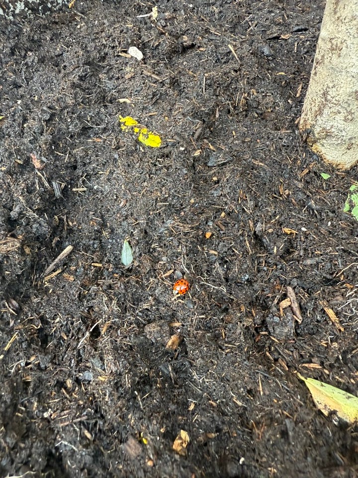 The lady bug on the soil in the potted plant on our walk to coffee district